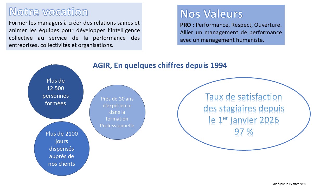 J’ai créé d’AGIR en 97. Après une expérience décisive en tant que manageur pour un grand Groupe, j’ai crée mon Cabinet de formation en Management combinant Performance et Humanisme pour un Mieux être au travail.